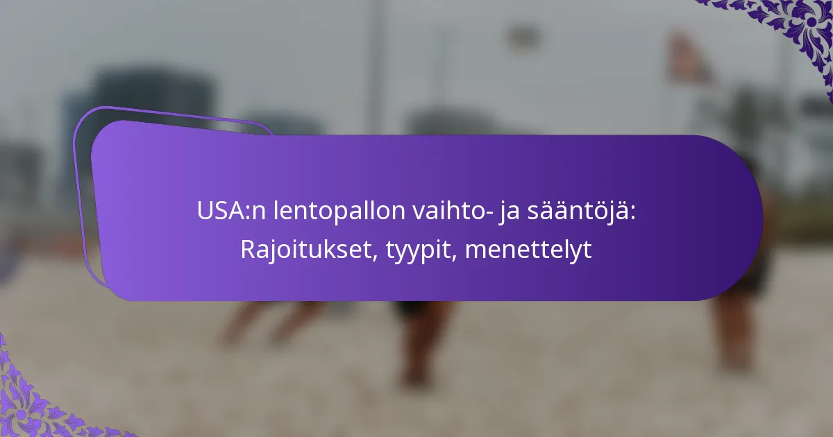 USA:n lentopallossa vaihdot ovat ratkaisevan tärkeitä pelin sujuvuuden ylläpitämiseksi ja reilun pelin varmistamiseksi, ja joukkueiden on navigoitava tiettyjen rajoitusten läpi. Erilaisia vaihtotyyppejä, kuten tavalliset, taktiset ja libero-spesifiset, jokaisella on omat sääntönsä ja strategiansa, jotka voivat parantaa joukkueen suorituskykyä. Ymmärtäminen määritellyistä menettelyistä vaihdon toteuttamiseksi on olennaista sujuvien siirtymien varmistamiseksi otteluiden aikana. Key sections in the article:… Read More »
